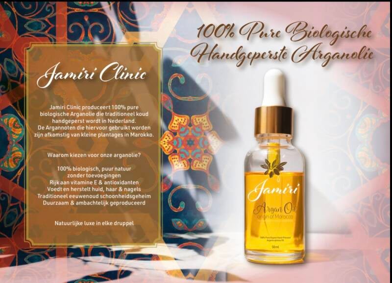 "De arganolie van JAMIRI CLINIC heeft mijn huid echt getransformeerd! Het is zacht, gehydrateerd en straalt als nooit tevoren."
